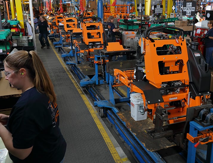 Every machine starts off as sheet steel or tube steel. We punch, press, bend, cut, weld, paint, assemble, package and ship our mowers, and we do it all in our Wisconsin factories (Mayville, West Bend, Beaver Dam, Fall River, and New Berlin). We even mold our own plastic tanks in our dedicated plastics facility in Horicon, WI. Scag makes its own outdoor power equipment; nobody else makes machines for us… and we do not make mowers for other brands.