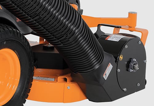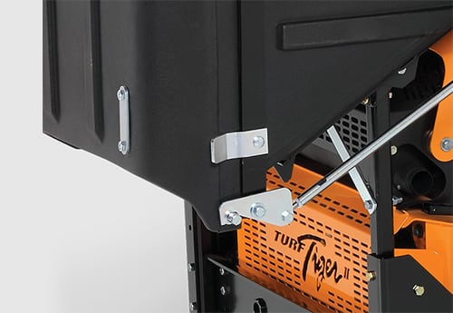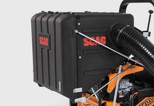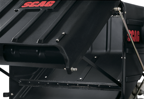 After the initial installation, the entire catcher assembly can be removed and reinstalled in minutes without any tools! Just pull three quick-pins, release the belt and lift it off. A 12-bushel-capacity hopper collects debris from a blower that pulverizes the debris, reducing particle size and increasing the density inside the hopper. What does this mean to you? Shredding the debris allows you to pack from 50% to over 100% more into the same amount of space when compared to other grass catchers on the market. Simply put, you will be able to collect more debris before you have to stop and empty the hopper. That saves time and greatly increases productivity. Talk to your Scag Dealer today to learn more about availability on this incredible collection system.