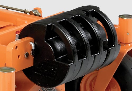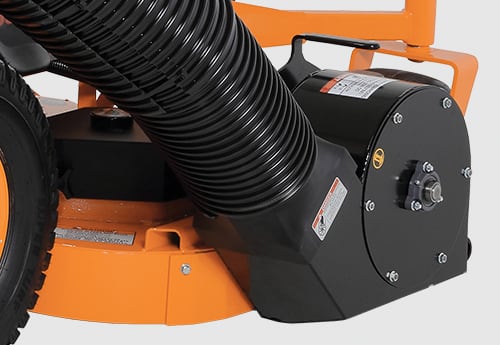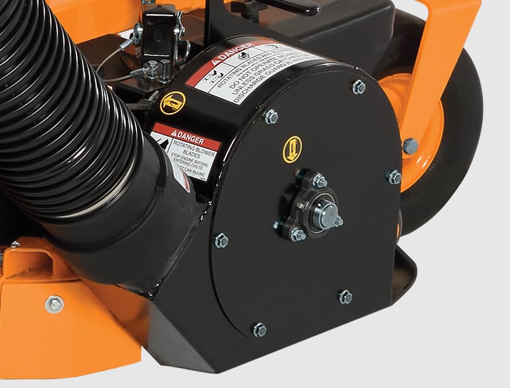 After the initial installation, the entire 3-Bag Grass Catcher (GC-3B) assembly can be removed and reinstalled in just minutes without any tools. Just pull three quick-pins, release the belt and lift it off. A 16-bushel capacity hopper collects debris from a blower that pulverizes the debris, reducing particle size and increasing the density inside the bags.